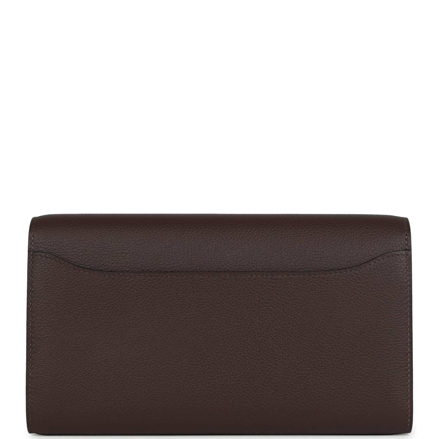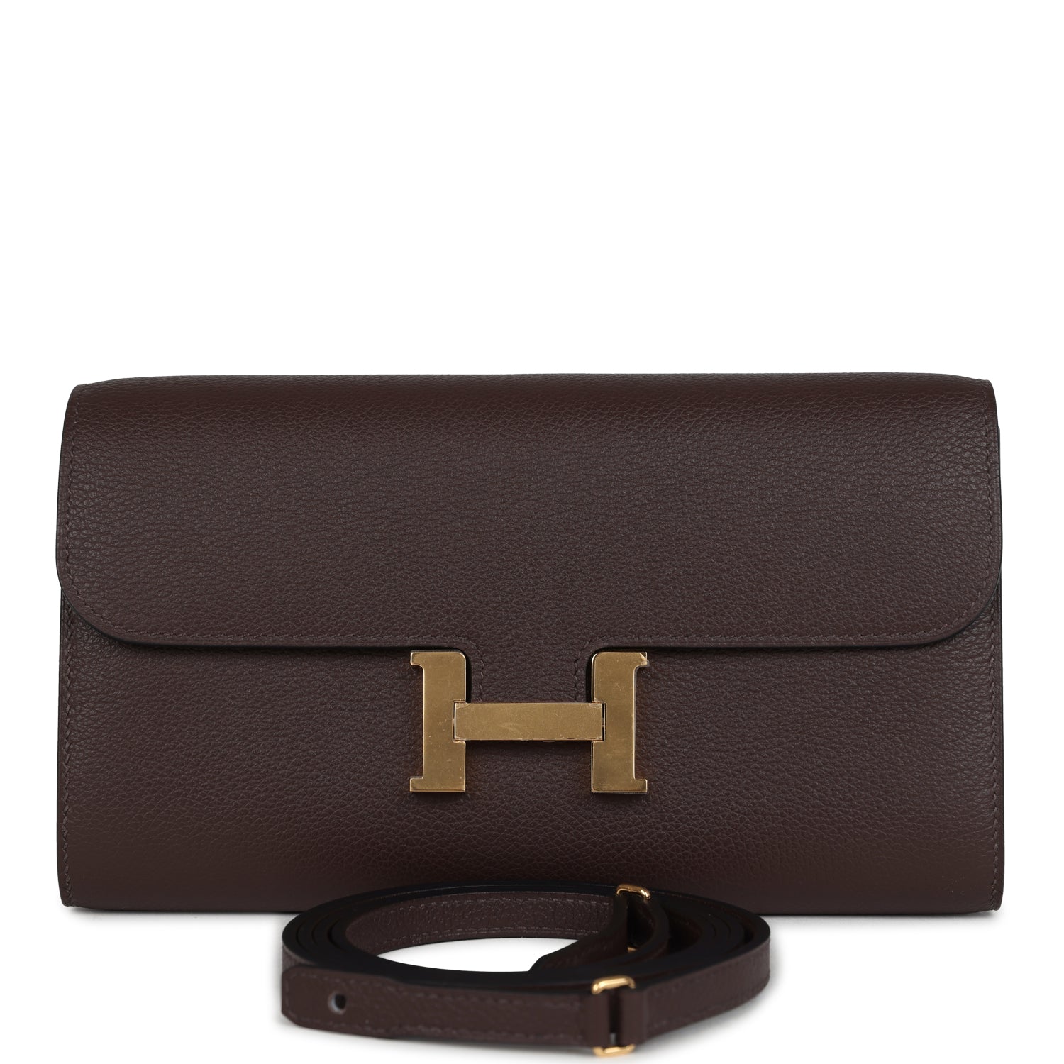 This Constance Wallet To Go is in Moka evercolor leather with gold hardware and has tonal stitching, metal "H" snap lock closure, open front compartment and removable crossbody strap.