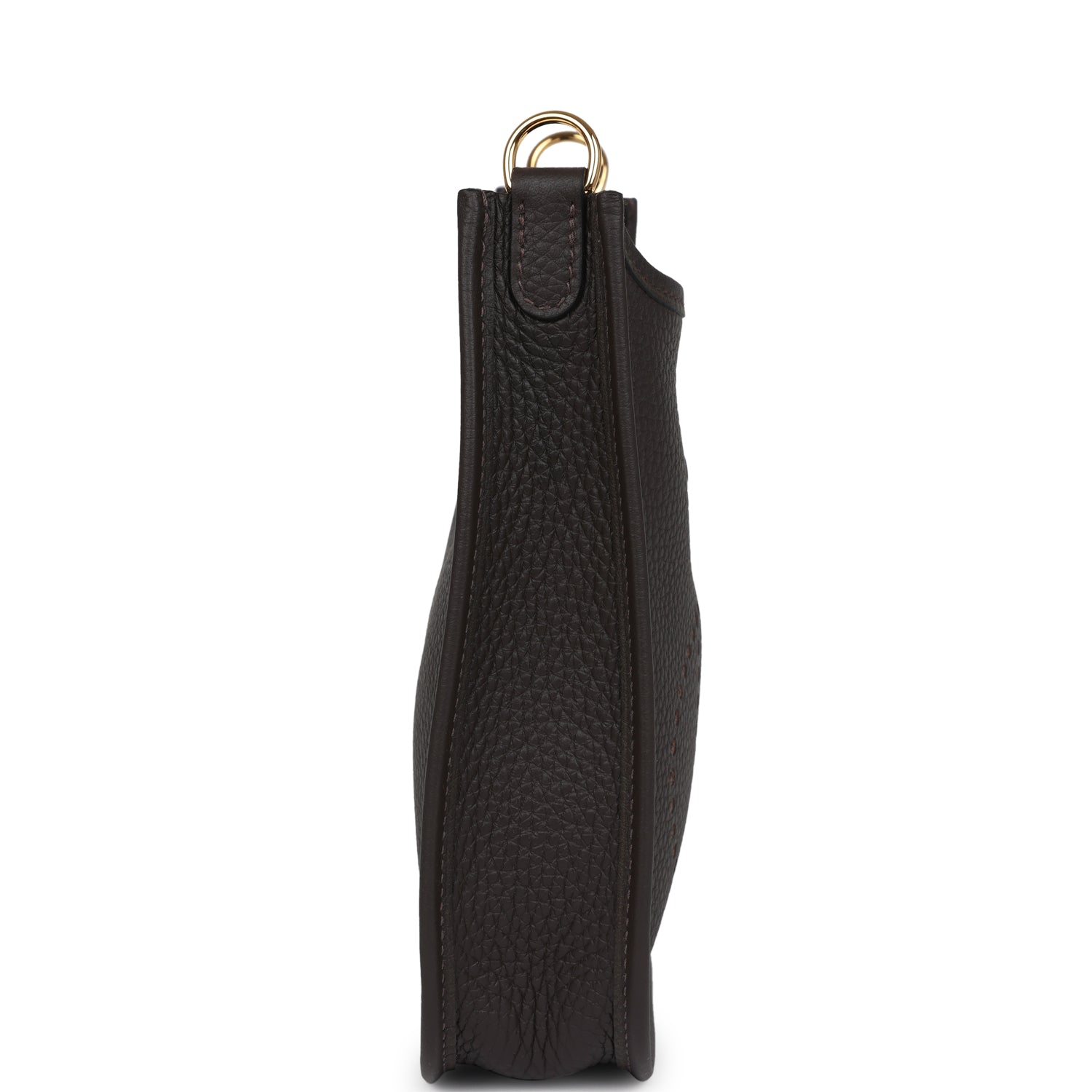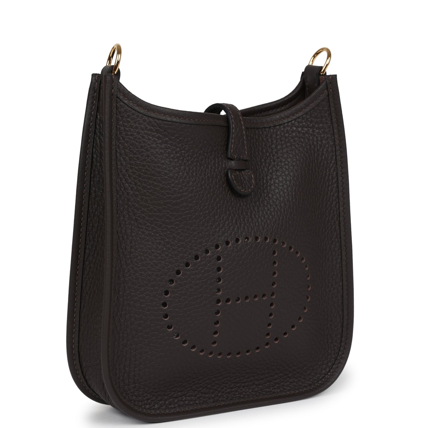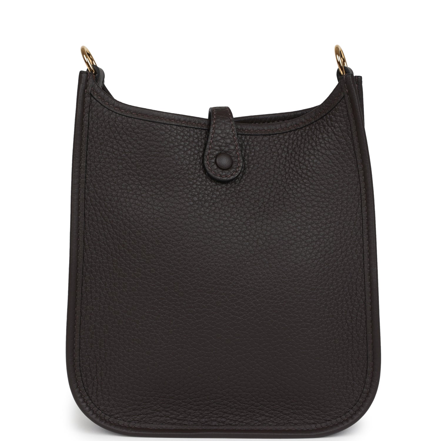 This Evelyne TPM is in Ebene clemence leather with gold hardware and features tonal stitching, pull tab top closure and a removable Etoupe and White zig zag canvas and leather shoulder/crossbody strap.