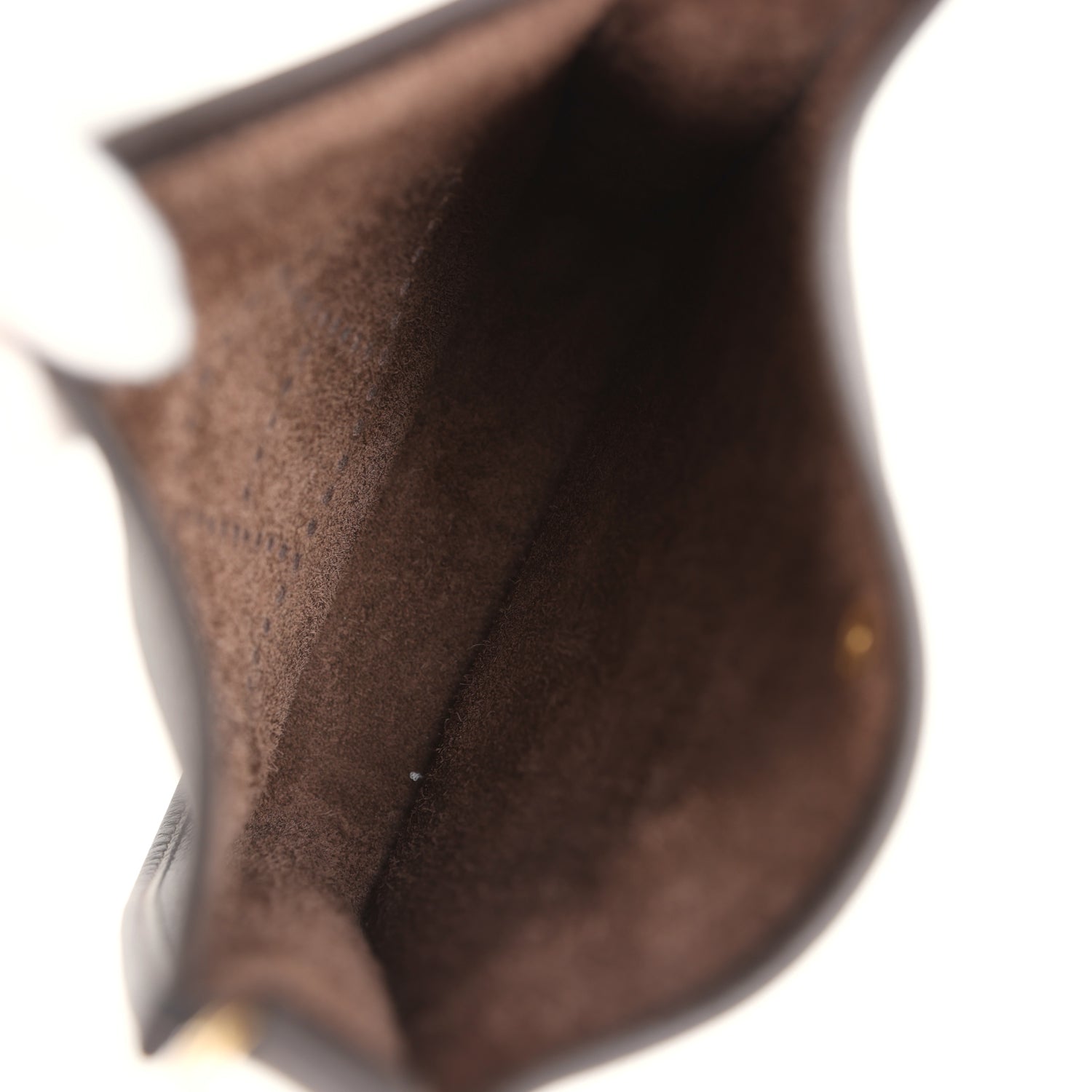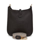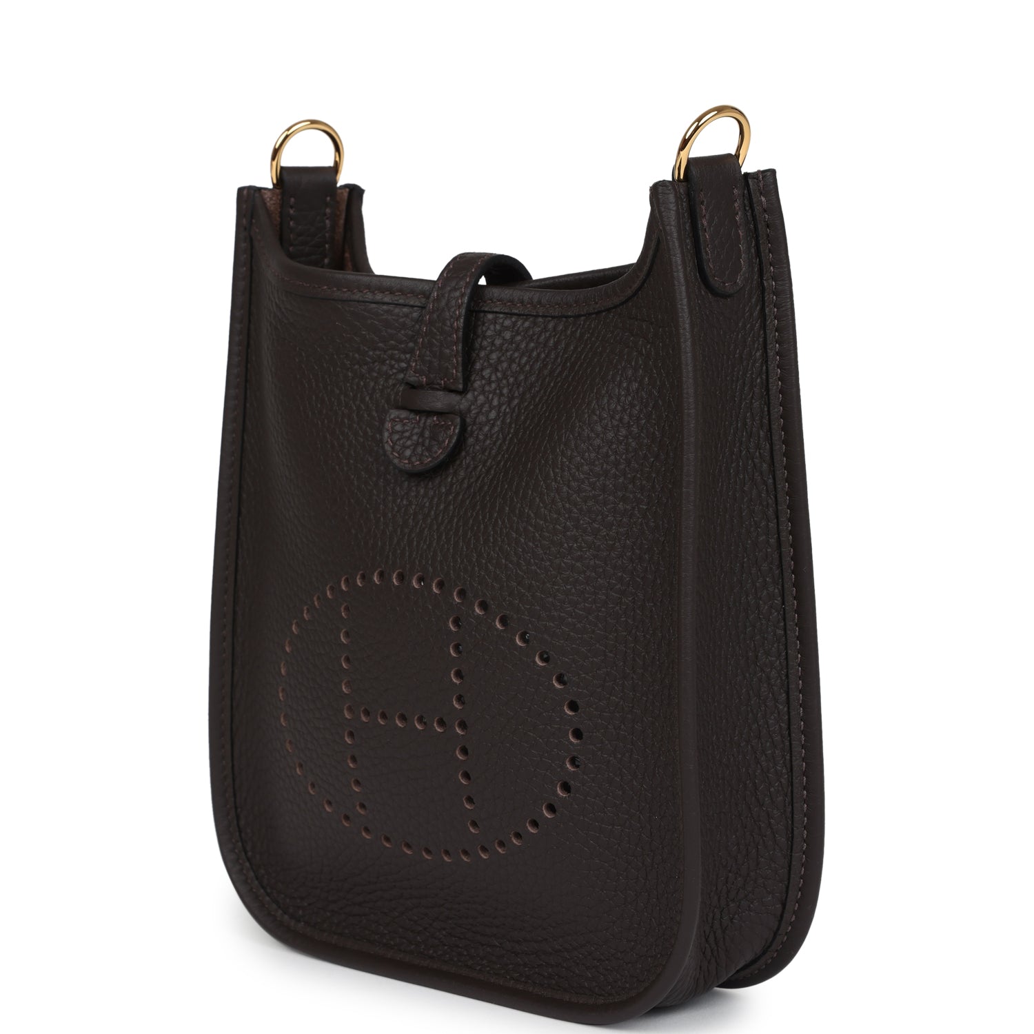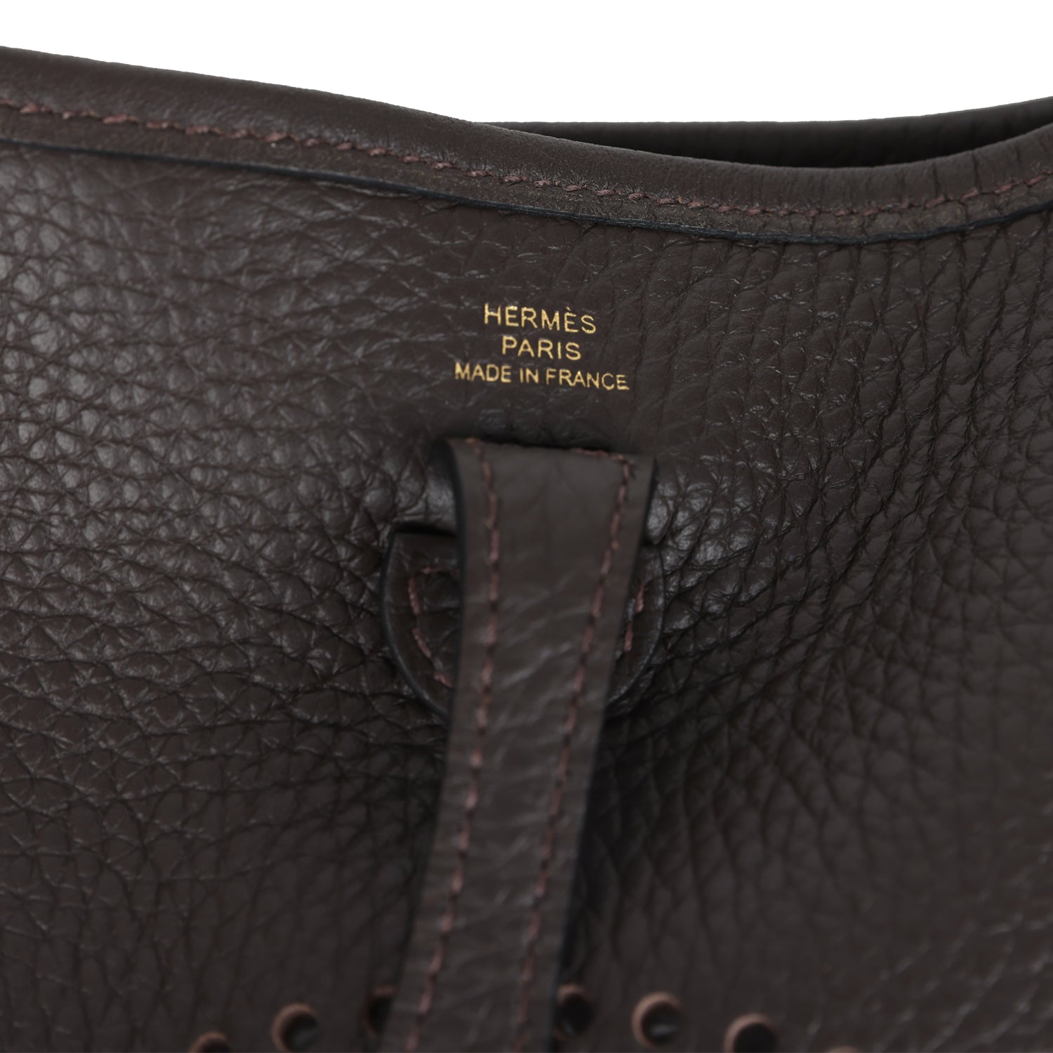 This Evelyne TPM is in Ebene clemence leather with gold hardware and features tonal stitching, pull tab top closure and a removable Etoupe and White zig zag canvas and leather shoulder/crossbody strap.