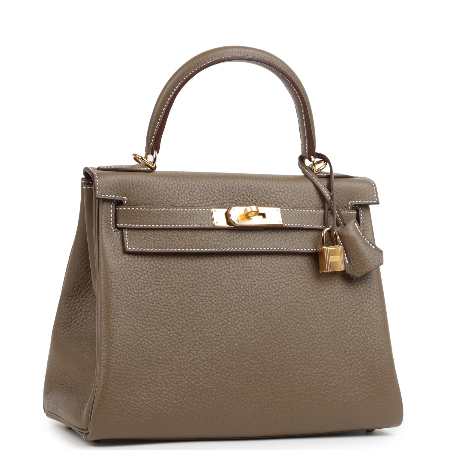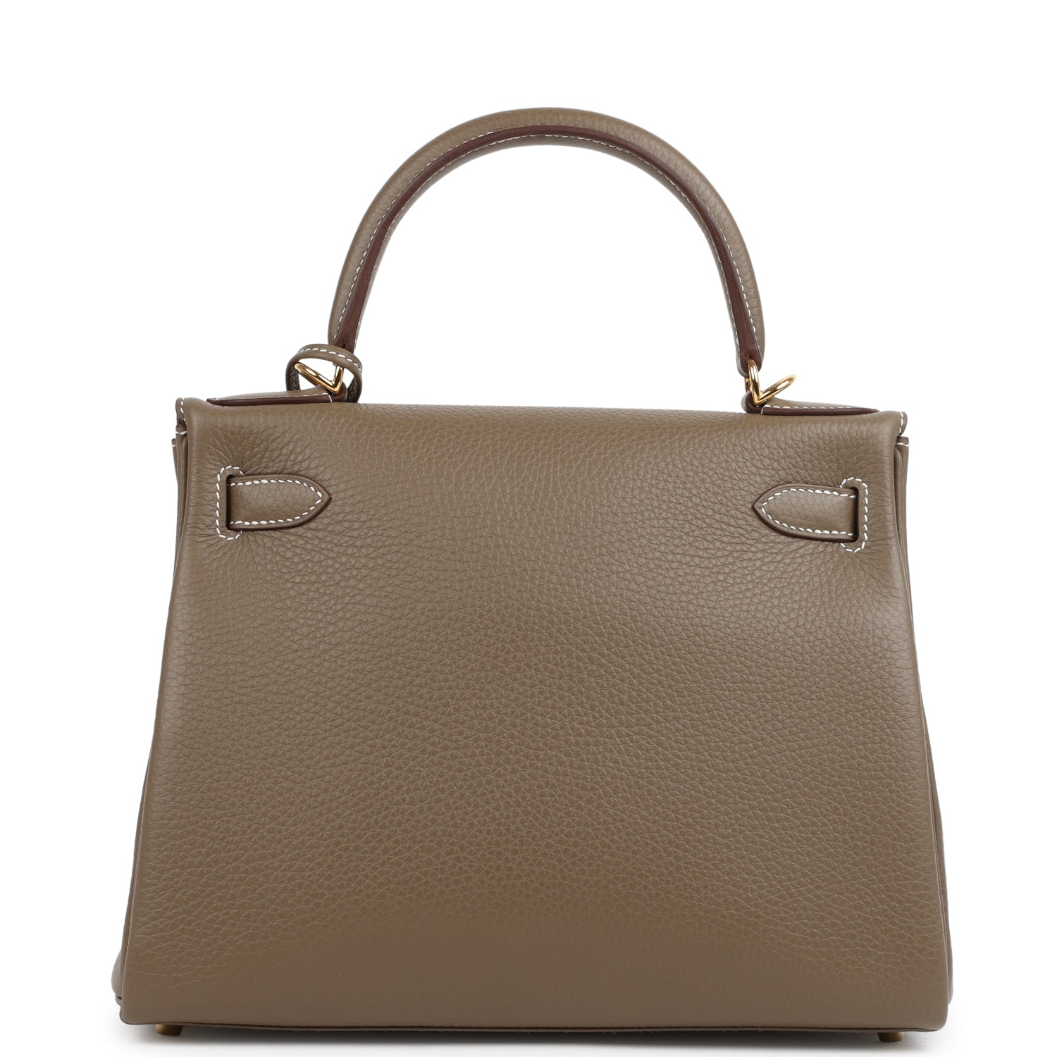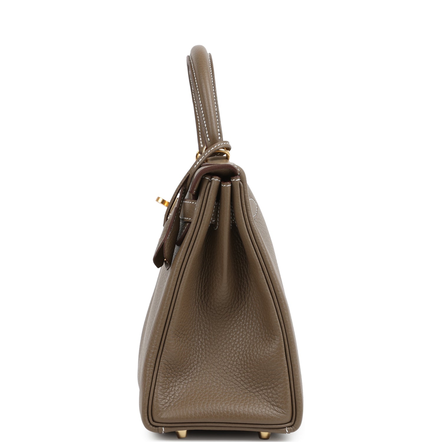 This Kelly, in the Retourne style, is in Etoupe clemence leather with gold hardware and has contrast stitching, front flap, two straps with center toggle closure, clochette with lock and two keys, single rolled handle and removable shoulder strap.