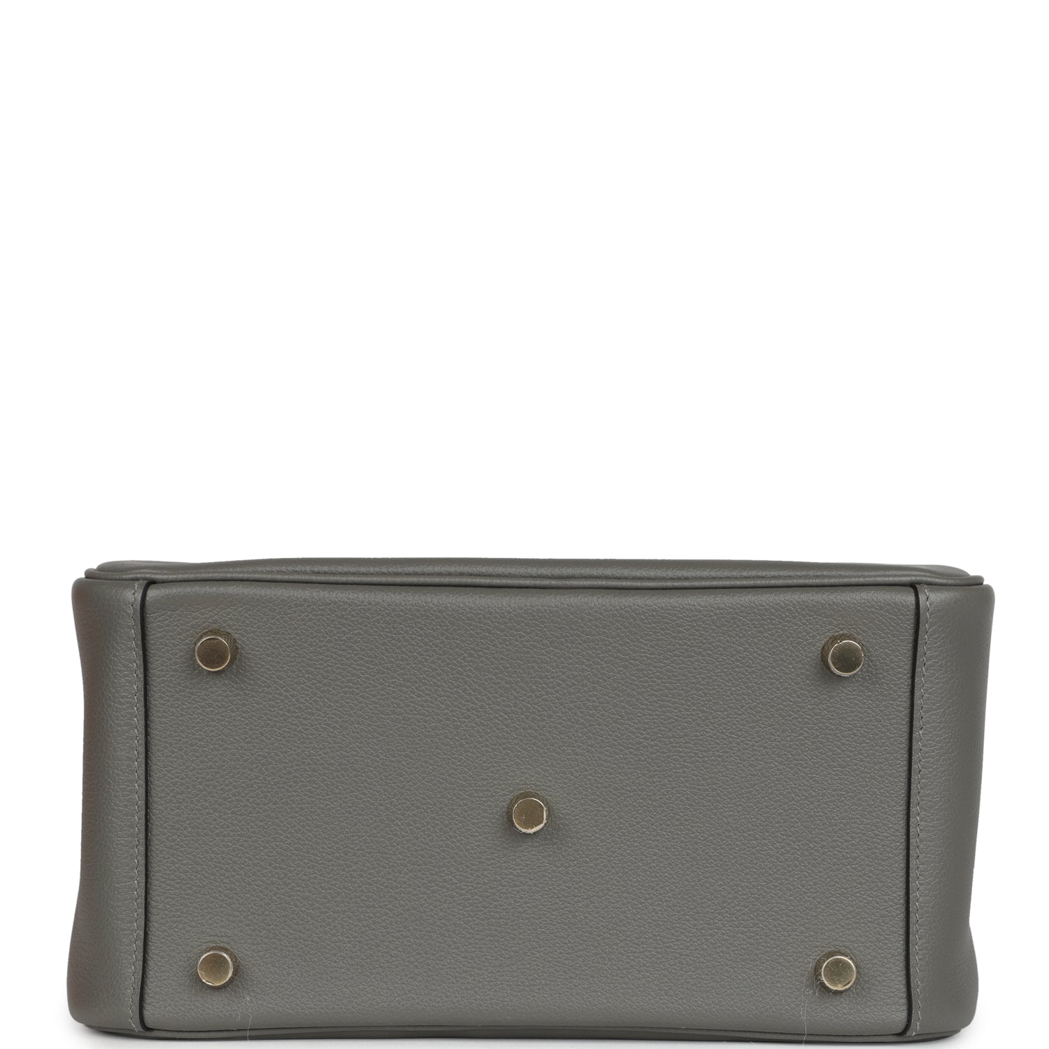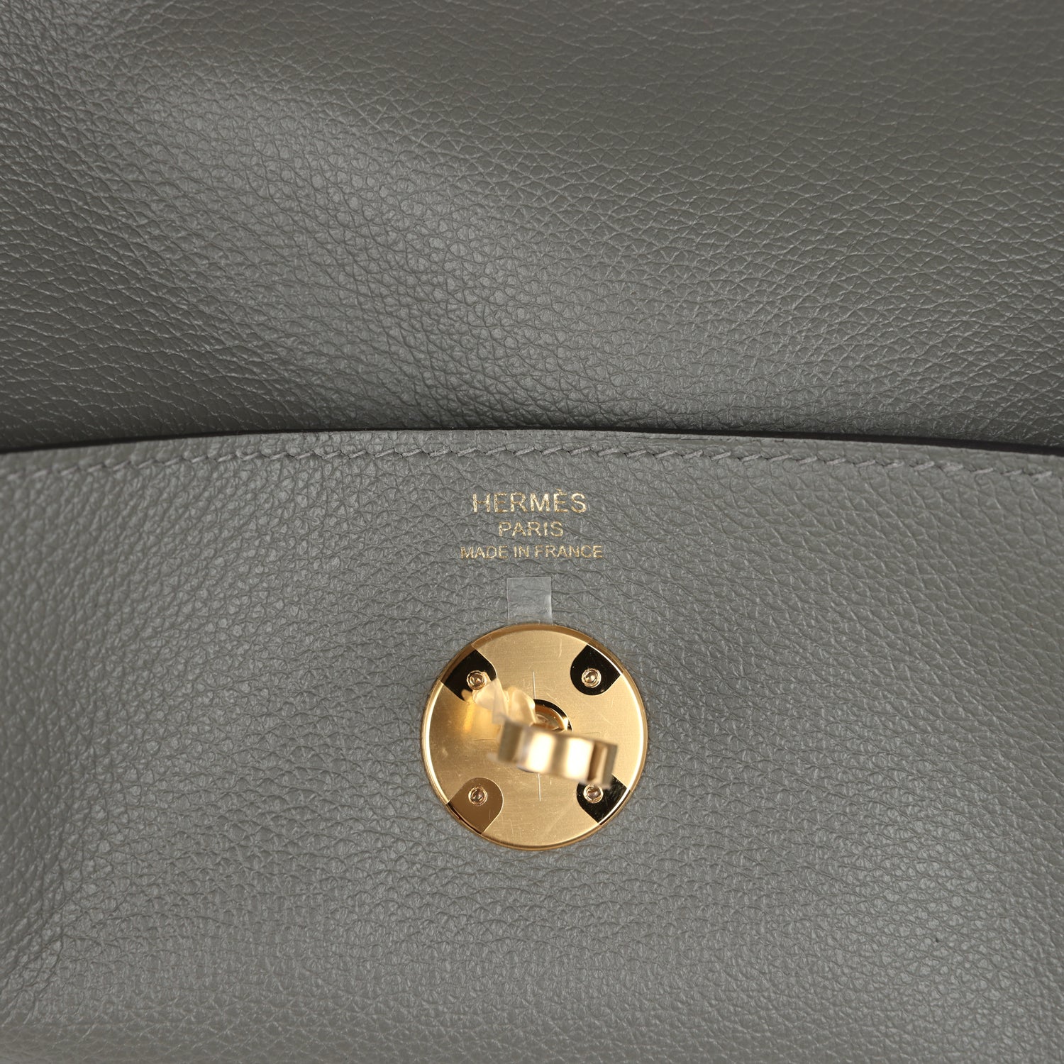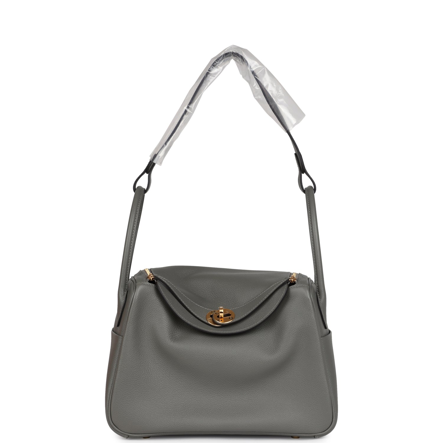 This Lindy is of Gris Meyer evercolor leather with gold hardware and features tonal stitching, double zipper pulls, center twist lock closure, five gold feet, and two top handles that are linked by a removable shoulder strap.