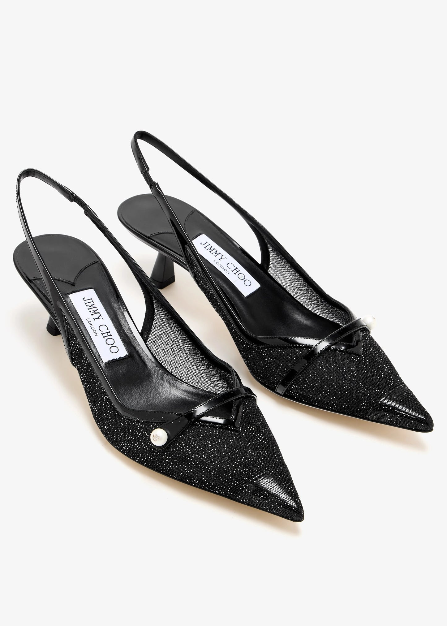 Italian-crafted from glitter mesh, Jimmy Choo's Amita 45 pumps are here to make a chic and statement-making finishing touch to your look. Detailed with a JC pearl, they're completed with a neat pointed toe, an easy-to-wear low heel, and an elasticated slingback strap.