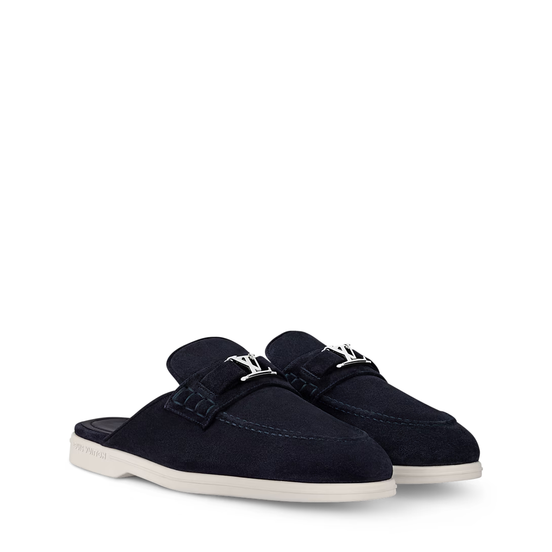 The Estate open-back loafer is reinterpreted in velvety suede calf leather. The slip-on design brings an original twist to the classic loafer with its silver-tone LV Initials accessory on the strap. This model is finished with a lightweight rubber outsole debossed with the Louis Vuitton signature.