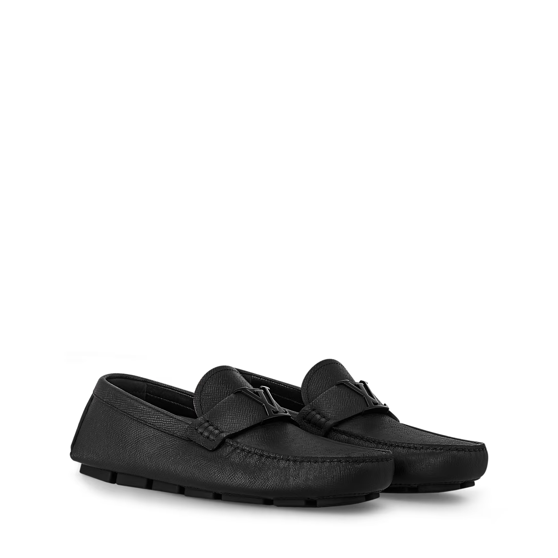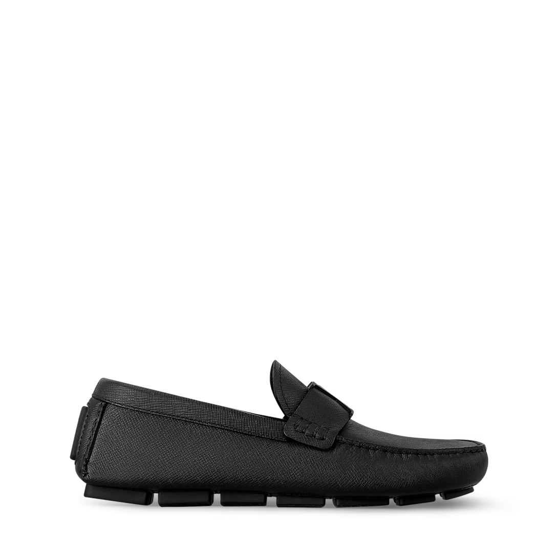 Crafted from emblematic Taiga leather, the LV Monza moccasin is a modern car shoe with a distinctive square-shaped toe. It has a tubular construction for suppleness and comfort, as well as a hand-stitched vamp signed with a large LV Initials accessory. Its outsole consists of squared rubber pads referencing the historic Louis Vuitton Damier pattern.