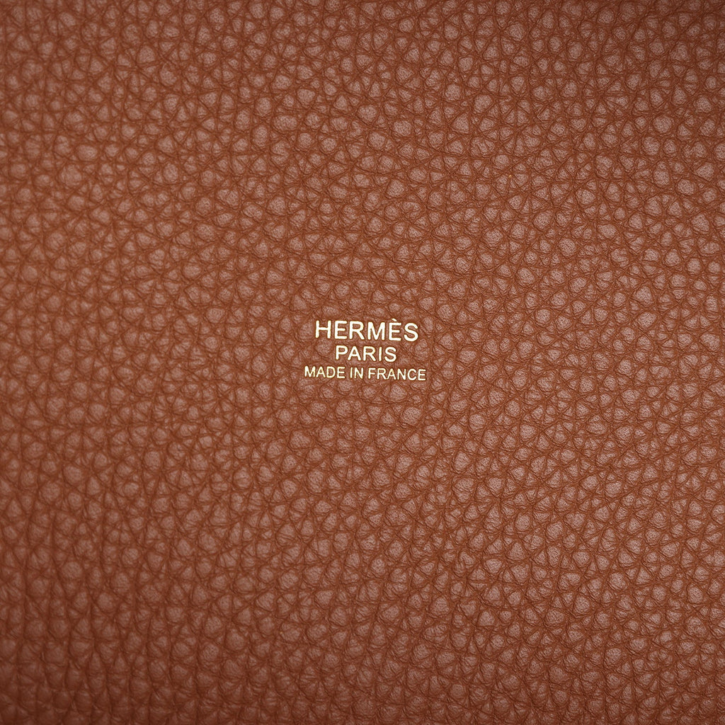 This Picotin Lock is in Gold clemence leather with gold hardware and has contrast stitching with two top handles.