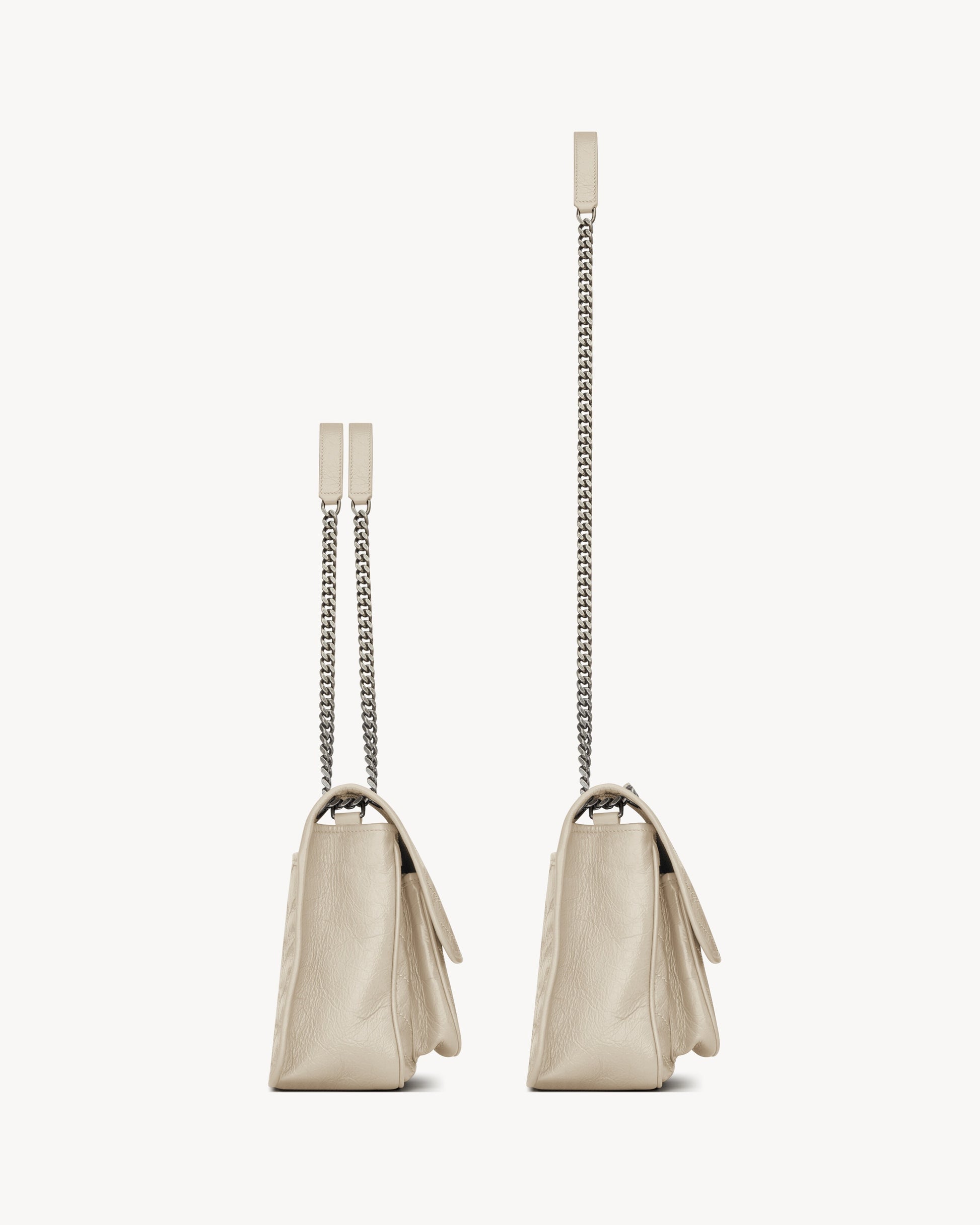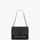 features a sliding chain strap that can be worn on the shoulder or crossbody.