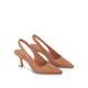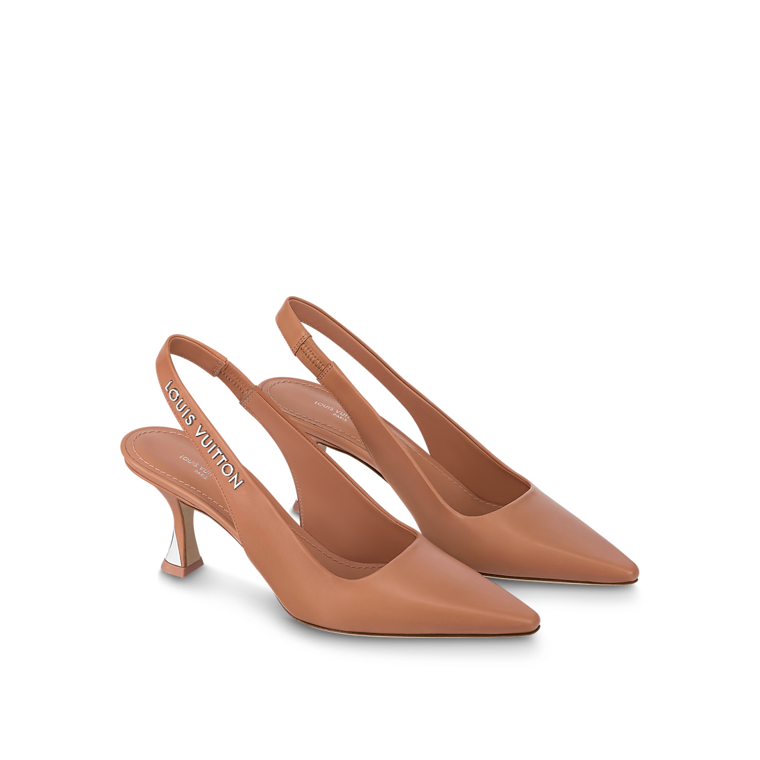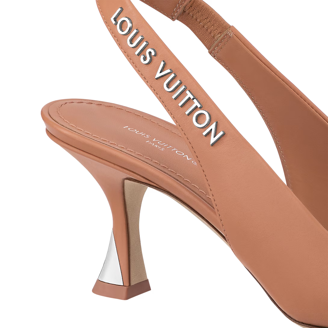 Supple calf leather complements the sleek lines of the Sparkle slingback pump. This model is characterized by its pointed toe and feminine flared heel, which is embellished with a metal insert engraved with the LV Circle logo. On the elasticized back strap, a silver-tone Louis Vuitton signature further enhances this refined design.