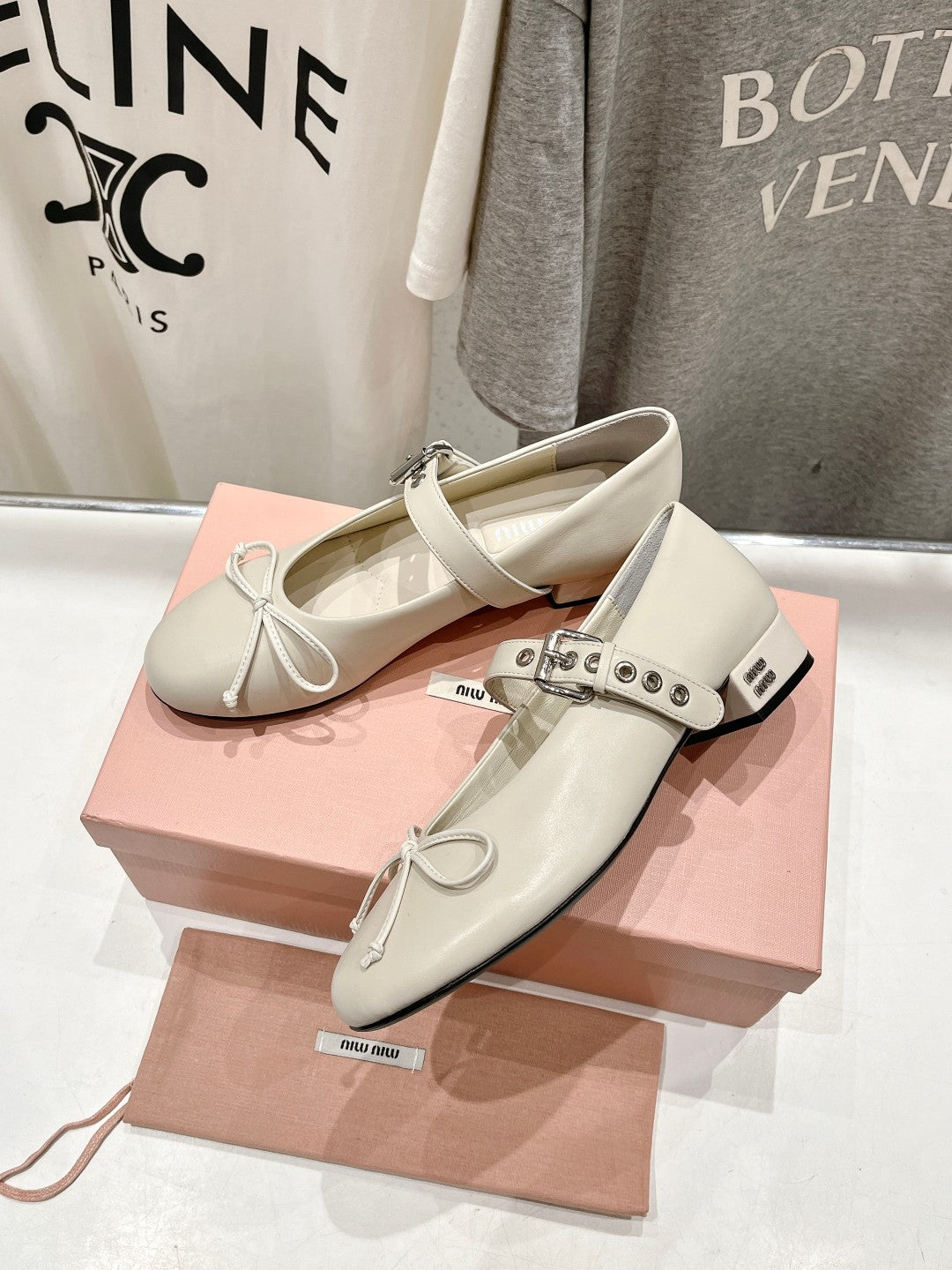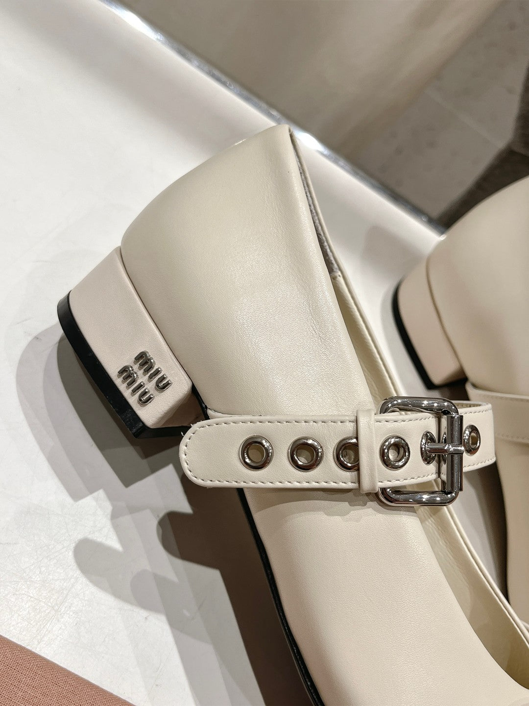 This shoe features an elegant classic design, combining the Beige color of the upper leather, with a shiny black front that adds the shoe with a belt and is made in the form of a silver metal chain with a small detail in the shape of a pearl or button when closing, which gives a touch of sophistication and elegance.