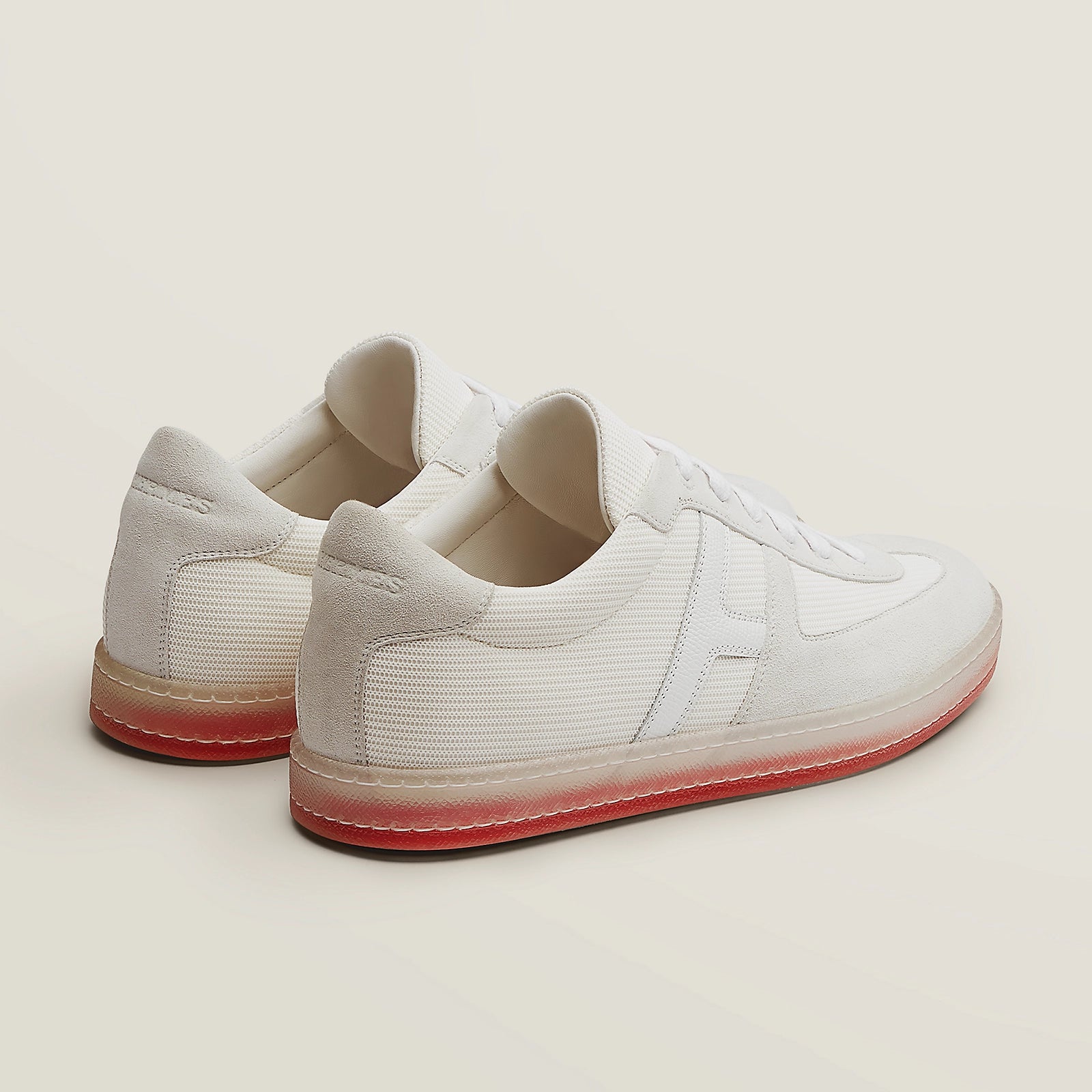 The Boomerang sneaker sets off along the sidewalk like its namesake. Its discreetly retro style meets contemporary lines and pop colors to epitomize elegance. The orange sole stamps Hermès DNA with each step.