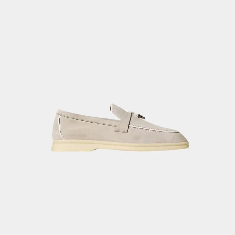 This shoe features an elegant classic design, combining the Beige color of the upper leather, with a shiny black front that adds the shoe with a belt and is made in the form of a silver metal chain with a small detail in the shape of a pearl or button when closing, which gives a touch of sophistication and elegance.