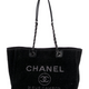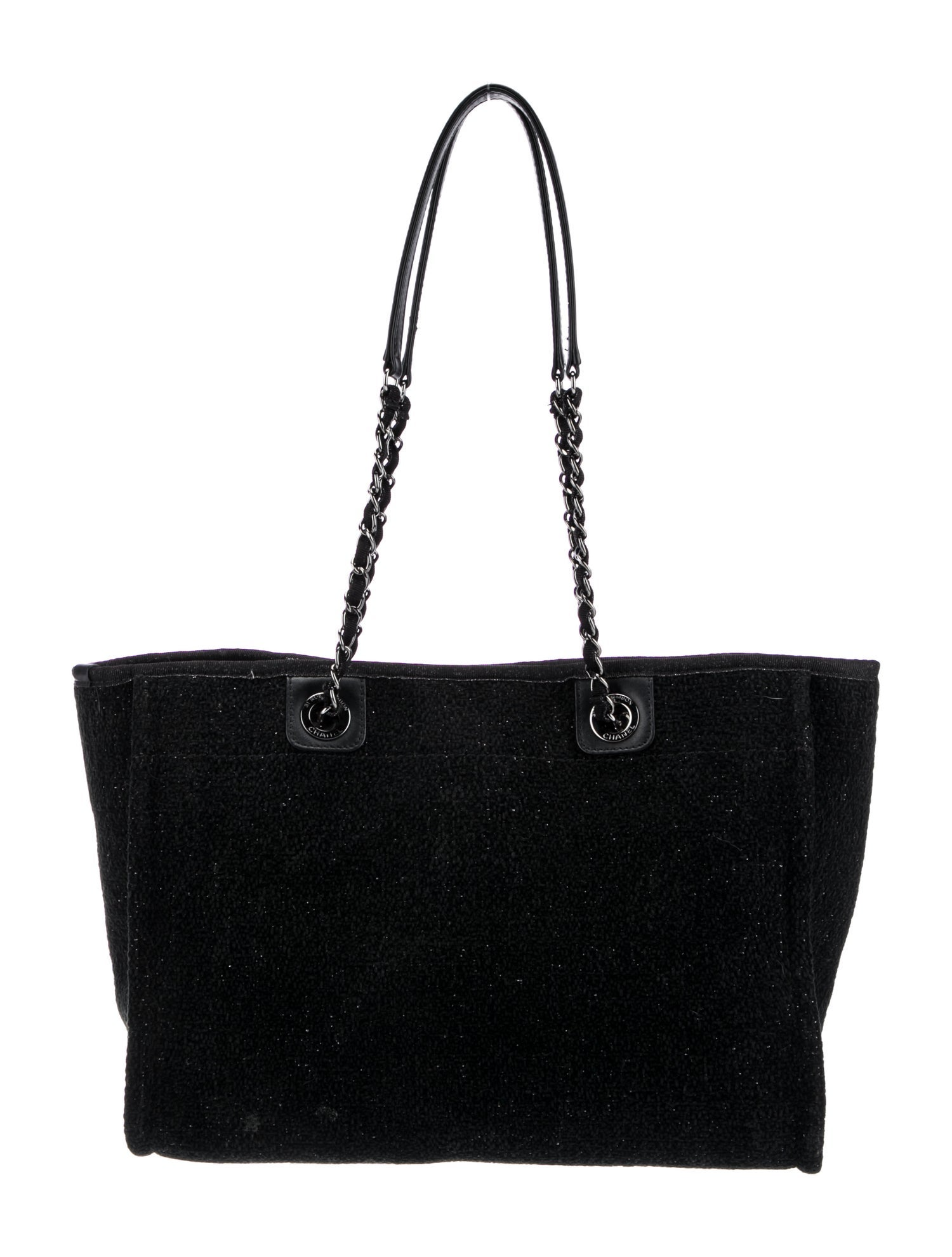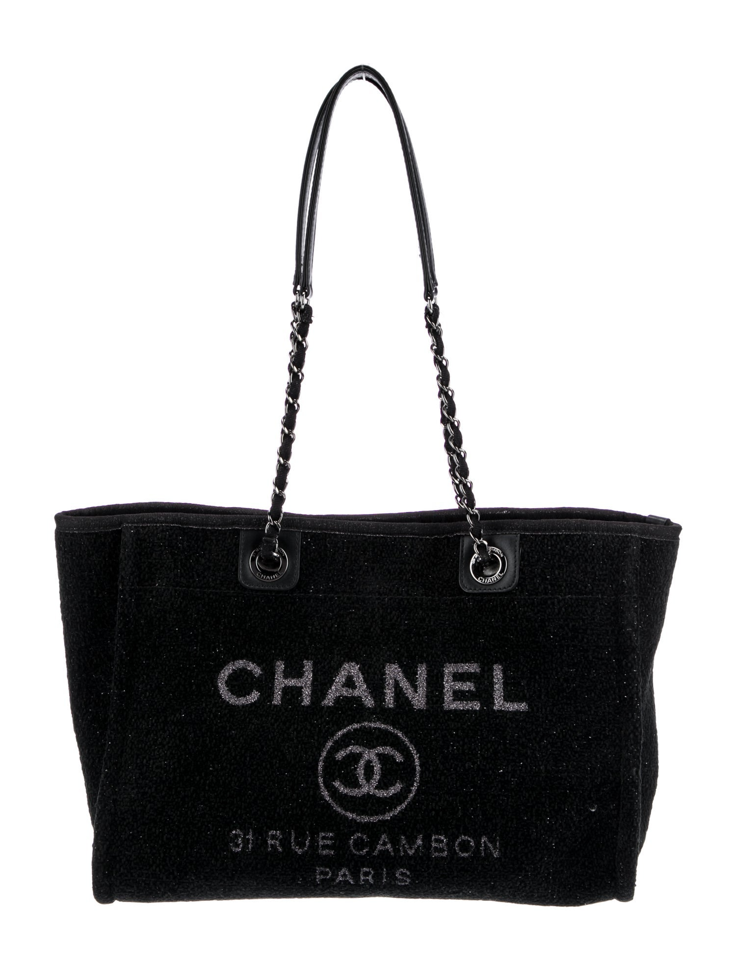 This is an authentic CHANEL Lurex Boucle Medium Deauville Tote in Black. This stylish tote is crafted of black fabric with metallic threads woven throughout. The bag features black leather top handles, fabric threaded silver shoulder straps, and a metallic Chanel logo on the front. The top is open to a black fabric interior with zipper and patch pockets and a key strap.