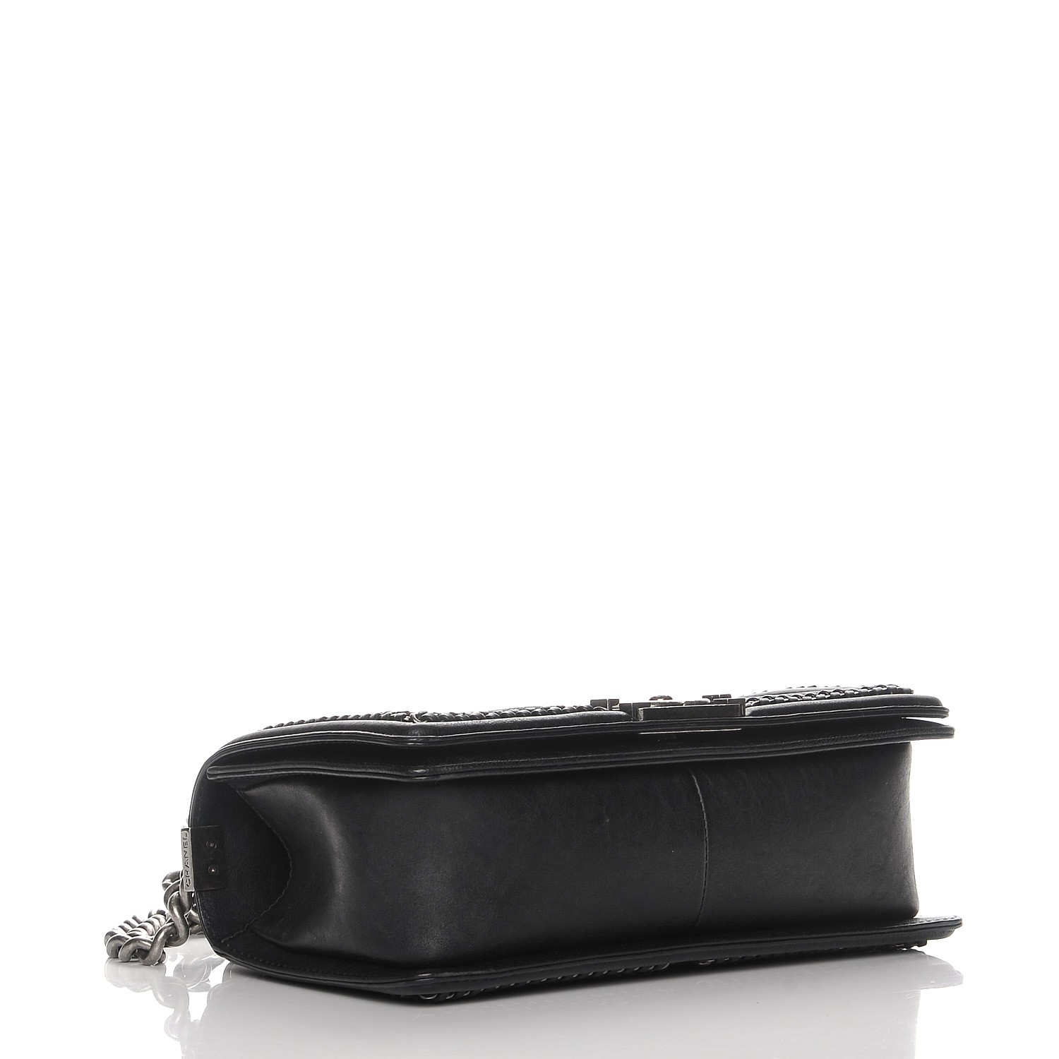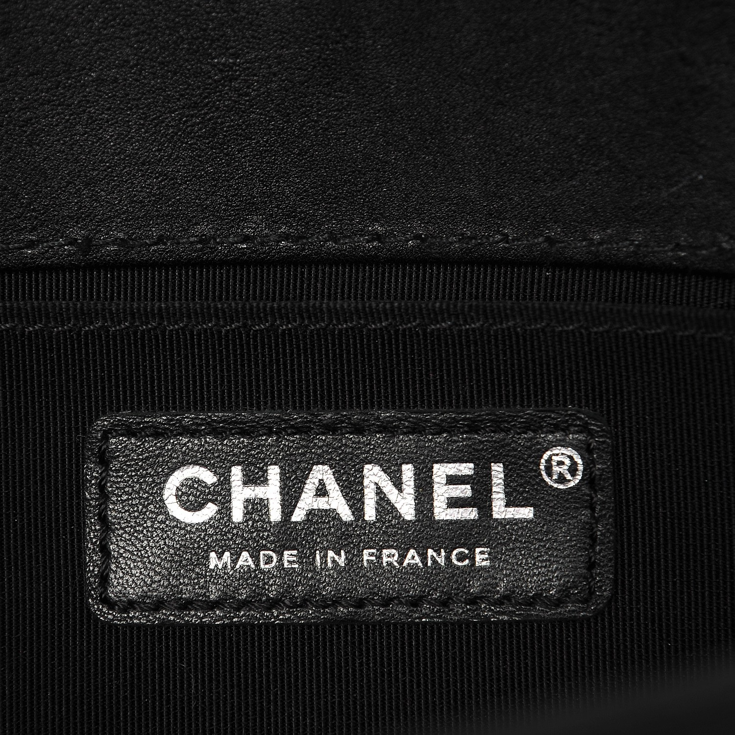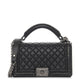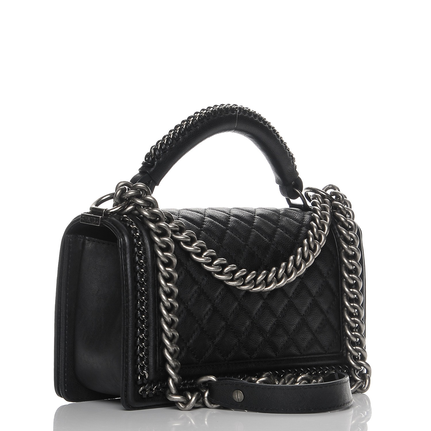 This is an authentic CHANEL Calfskin Quilted Medium Boy Top Handle Flap Black. This chic shoulder bag is crafted of quilted black calfskin leather and a peripheral stitching lined with ruthenium chain. The bag features a sturdy rolled leather looping top handle with an embellished stitch, a handbag or shoulder chain with a black leather interior and a bold ruthenium Chanel CC press-lock. The flap opens to a black interior ideal for day or evening wear with the timeless style of Chanel!