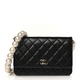 This is an authentic CHANEL Lambskin Quilted Pearl Wallet On Chain WOC in Black. This chic and stylish wallet is crafted of luxuriously soft diamond quilted lambskin leather in black. This crossbody bag features a gold chain link leather threaded pearl lined crossbody shoulder strap and a facing flap with a small pearl lined gold Chanel CC logo. The flap opens to a black fabric interior with card slots, a zipper compartment, and patch pockets.