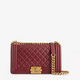 This is an authentic CHANEL Lambskin Quilted Medium Boy Flap in Dark Red. This chic shoulder bag is crafted of luxuriously textured diamond quilted caviar leather in red, with a linear quilted peripheral border. The bag features an aged gold chain-link shoulder strap with a shoulder pad, and a matching gold boy CC press lock on the crossover flap. This opens the bag to a red fabric interior with a patch pocket.