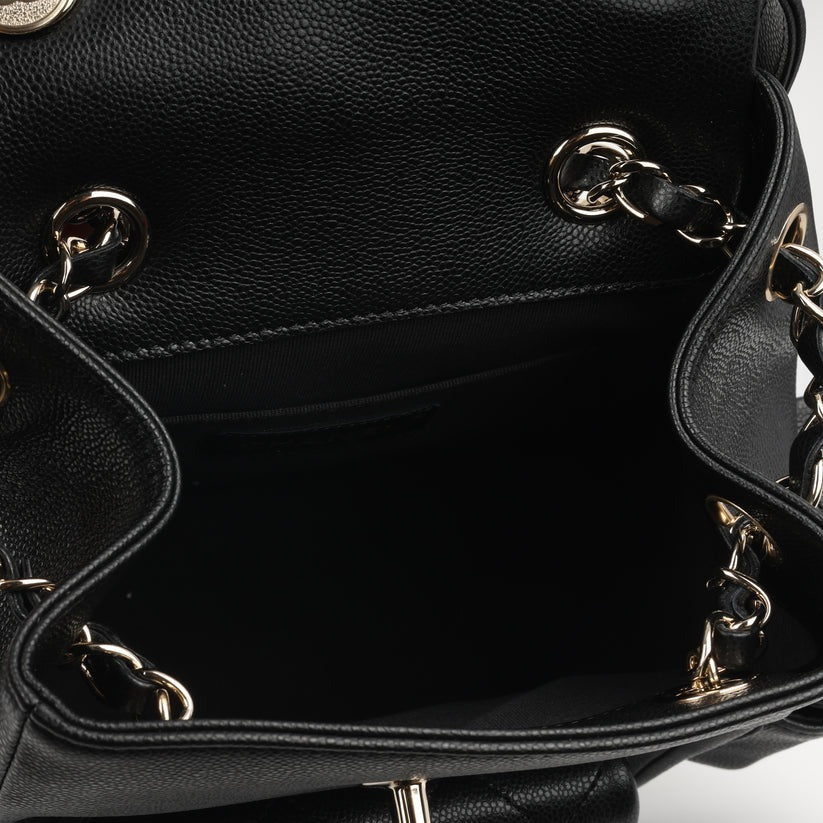 Carefully crafted from quilted caviar leather, Chanel presents their Duma backpack. Petite and sweet, this bag makes for a chic piece to take around with you throughout the day. It features Chanels classic interwoven back straps along with top handles to carry it handheld.