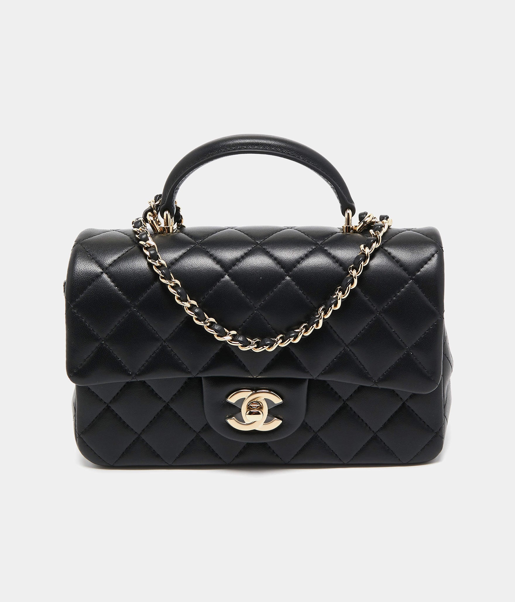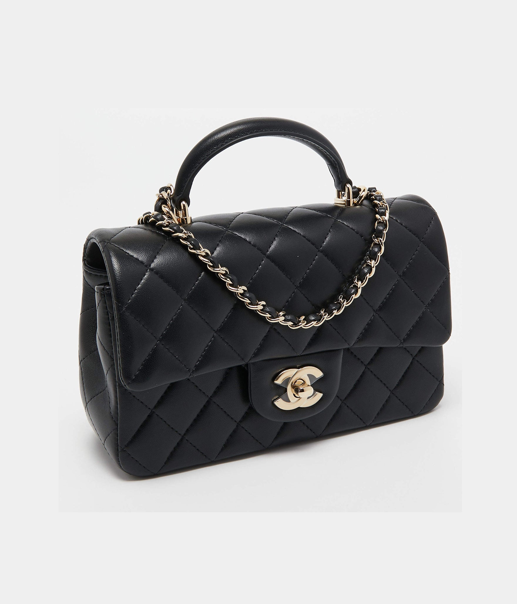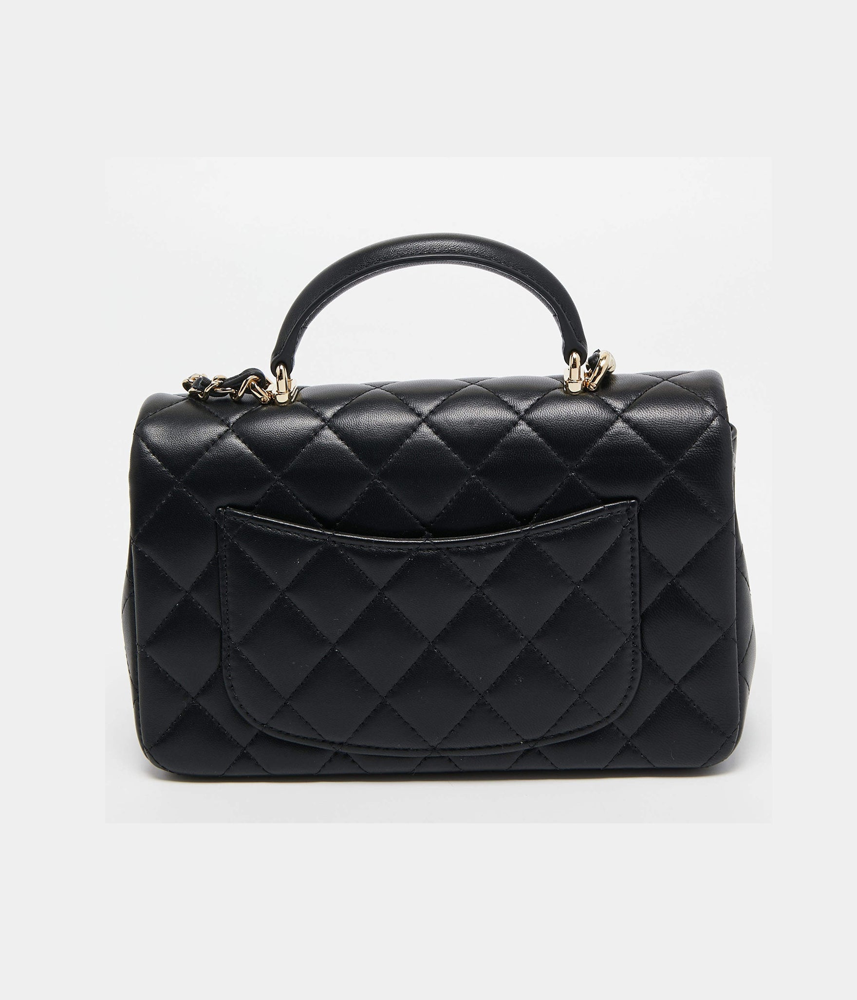 A timeless flap bag with a quilted surface and a structured top handle. Designed with a sleek silhouette and finished with metallic accents, this piece balances classic charm and modern versatility.