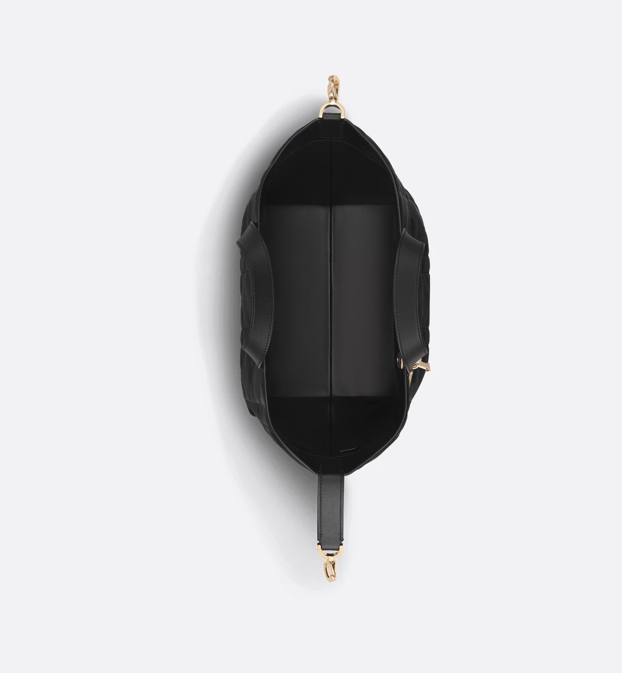 The Dior Toujours vertical tote bag is distinguished by a modern and practical design. Crafted in black calfskin with Macrocannage topstitching, it has a spacious interior compartment to accommodate all the essentials. Its thin leather strap closure keeps items secure, while the D of the CD Lock clasp twists to adjust the sides and enhance the bag's silhouette. The leather top handles are completed by a removable leather strap, allowing the small bag to be carried by hand, worn over the shoulder or crossbody.