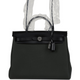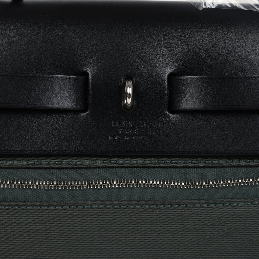 This Hermès Herbag Zip Zip 31 PM Black Vache Hunter leather and Vert Mangrove Toile Militaire canvas with gold hardware and has tonal stitching, front flap, two straps with center clou de selle closure, clochette with lock and two keys, back zip pocket, single rolled handle and shoulder strap.