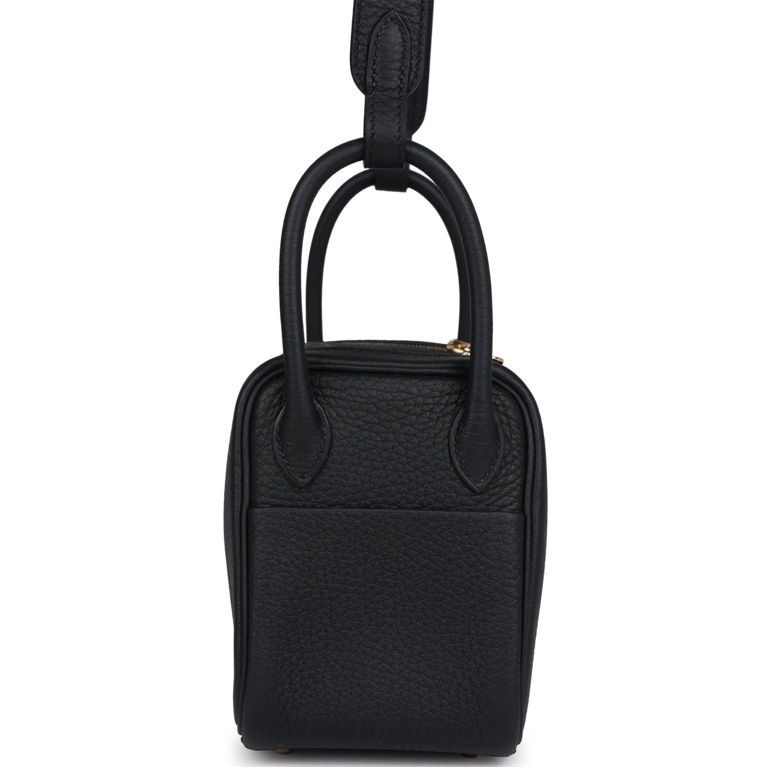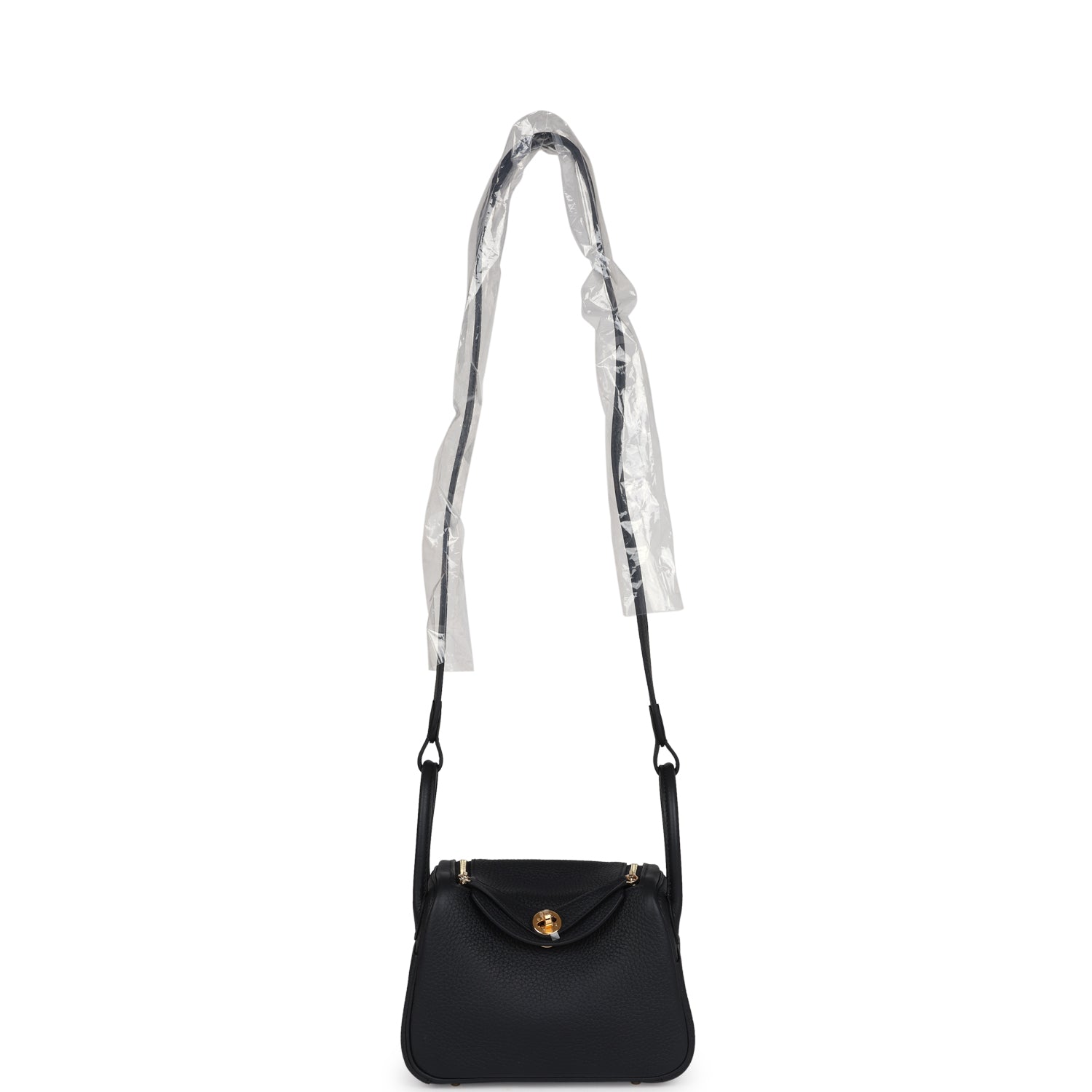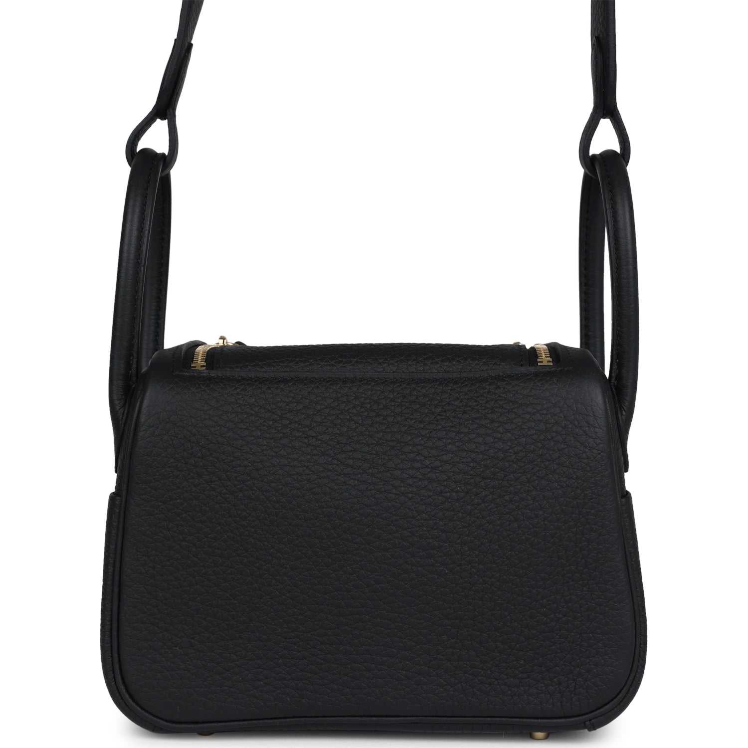 This Mini Lindy II is in Black clemence leather with gold hardware and has tonal stitching, double zipper pulls, front Hermès twist lock, single pocket on each side, two rolled top handles linked by a flat shoulder strap.