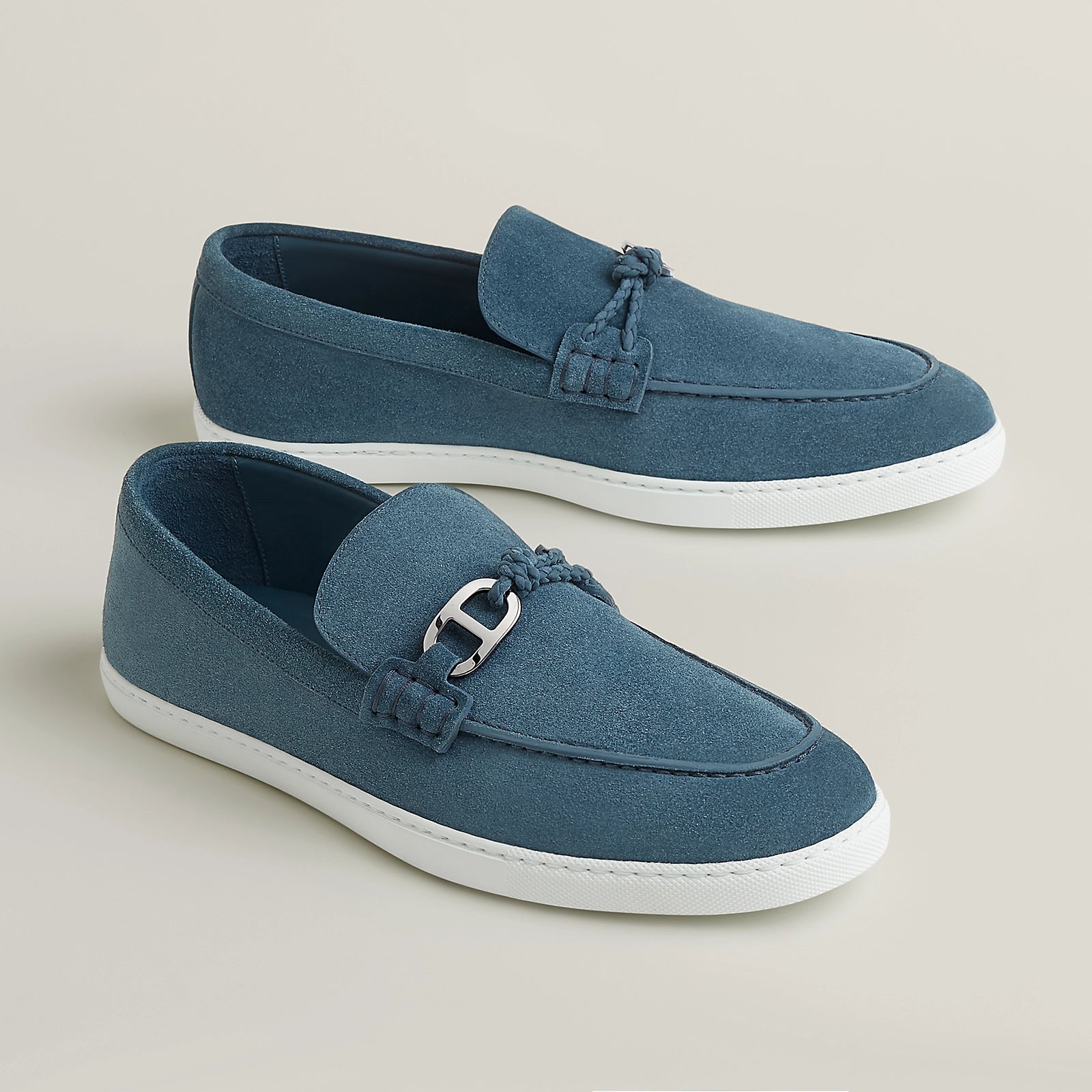 Driving loafer in suede calfskin with braided leather cord and palladium-plated Chaine d'Ancre buckle.