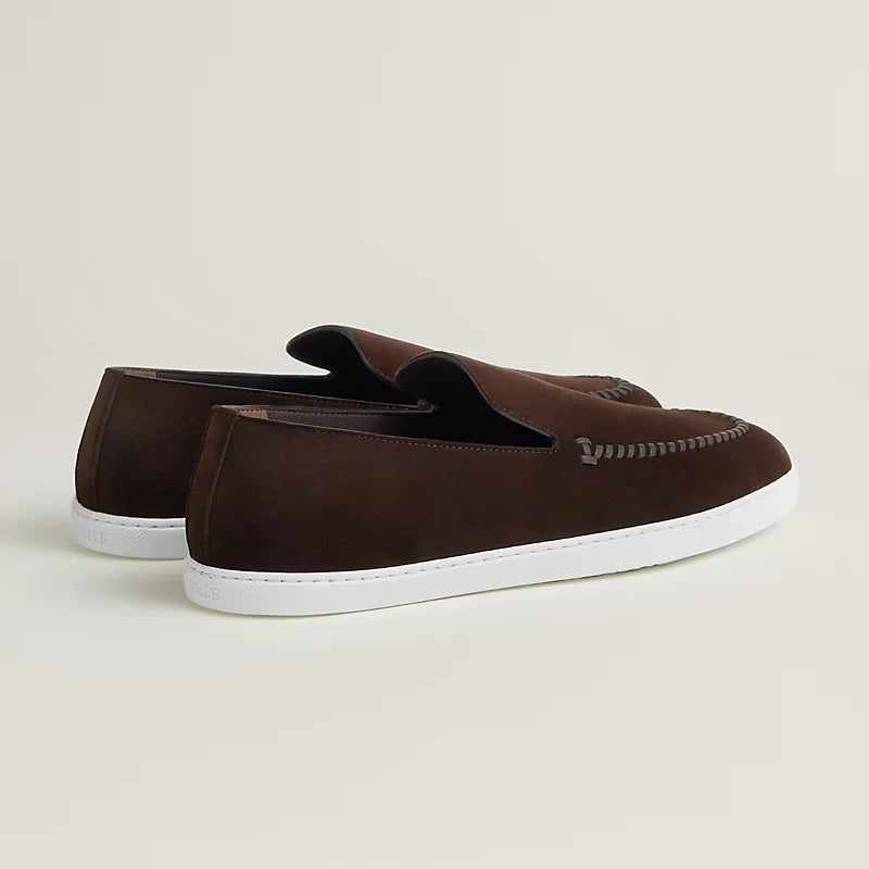 Loafer in suede goatskin with braided leather detail and rubber sole.
