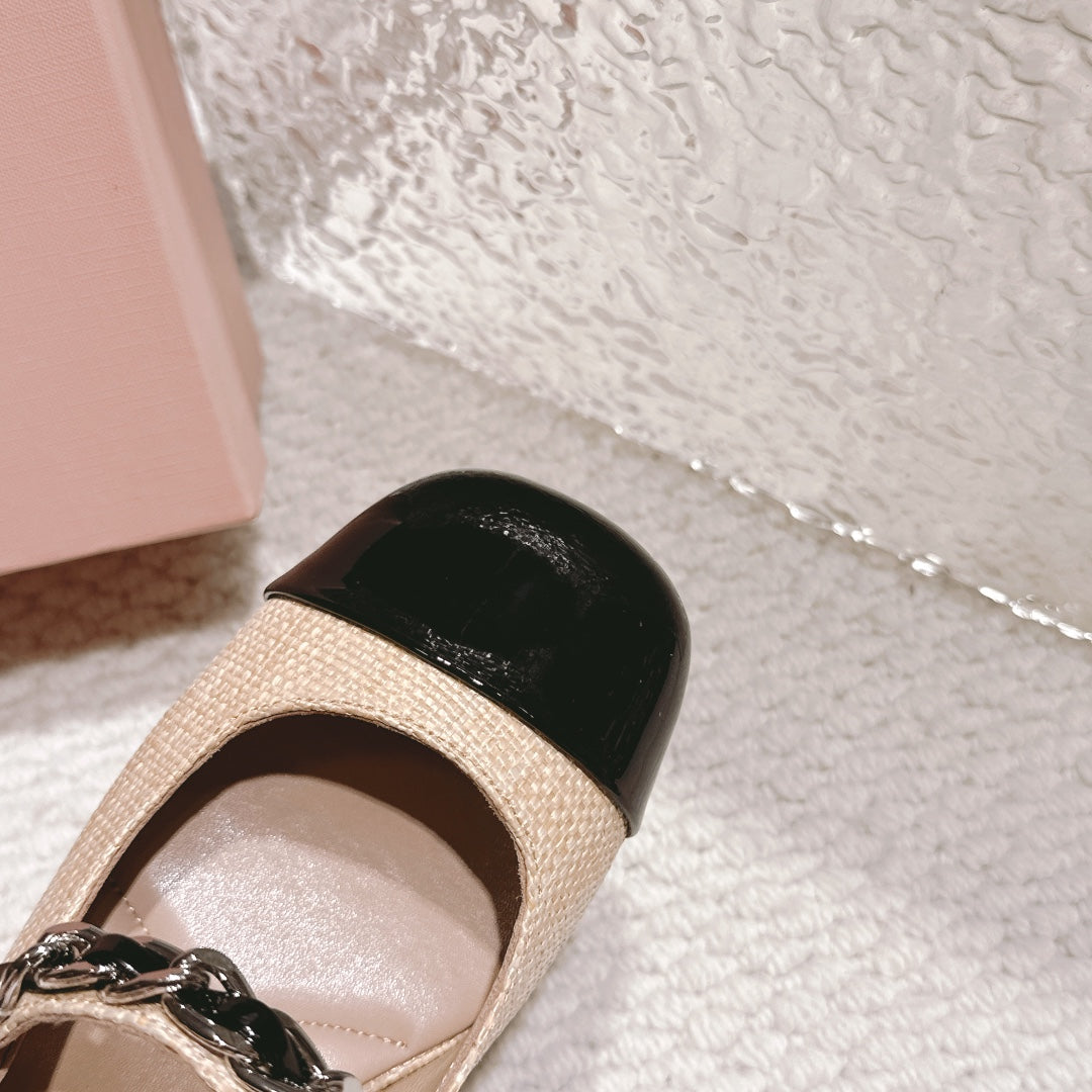 This shoe features an elegant classic design, combining the Dark beige color of the upper leather, with a shiny black front that adds the shoe with a belt and is made in the form of a silver metal chain with a small detail in the shape of a pearl or button when closing, which gives a touch of sophistication and elegance.