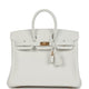 This Birkin is in New White swift leather with gold hardware and has tonal stitching, two straps with front toggle closure, clochette with lock and two keys and double rolled handles.