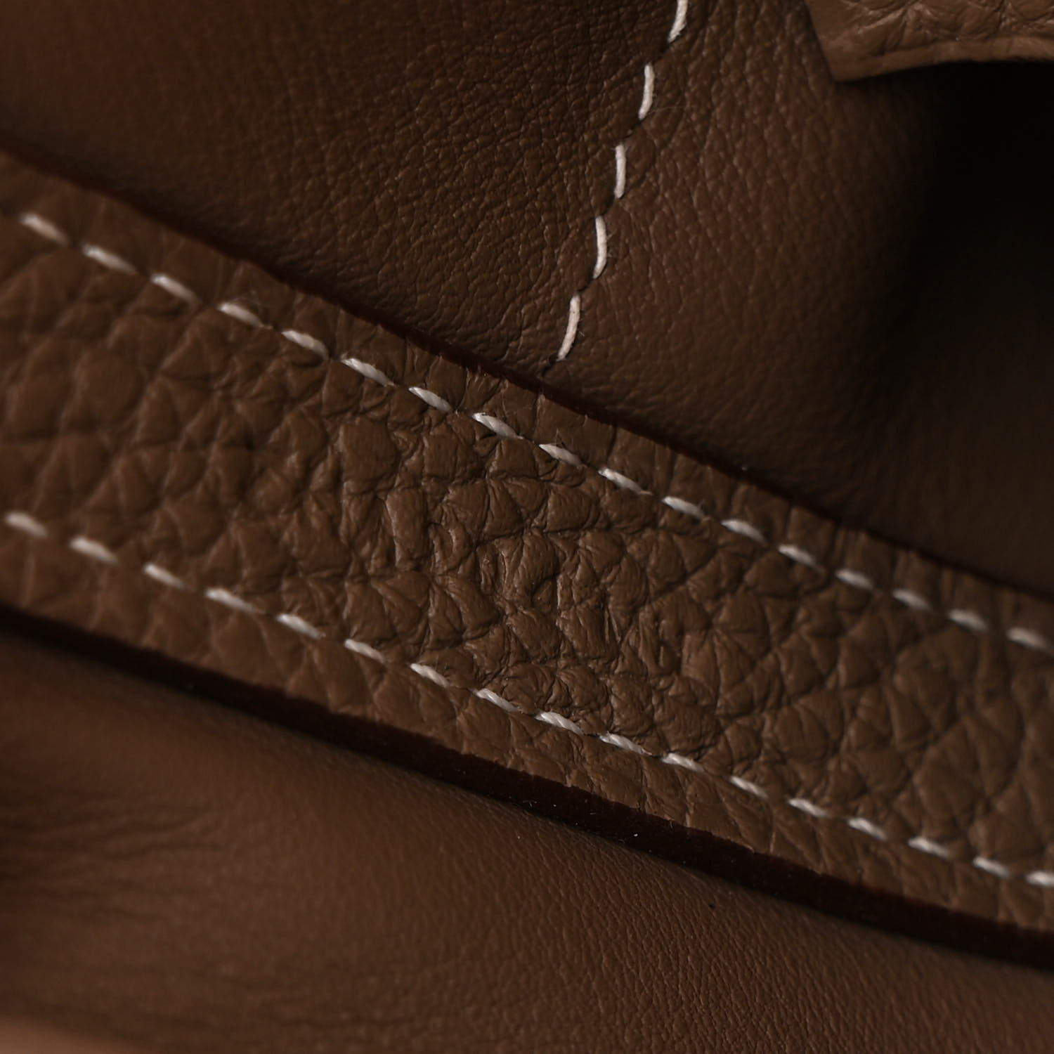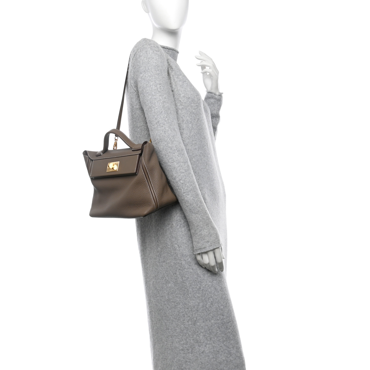 This is an authentic HERMES Togo Swift 24/24 29 in Etoupe. This handbag is crafted of textured calfskin leather in taupe. The bag features a reinforced leather top handle, an optional leather shoulder strap, gold plated hardware, and a turn lock. The flap opens to a matching leather interior with a zipper pocket.