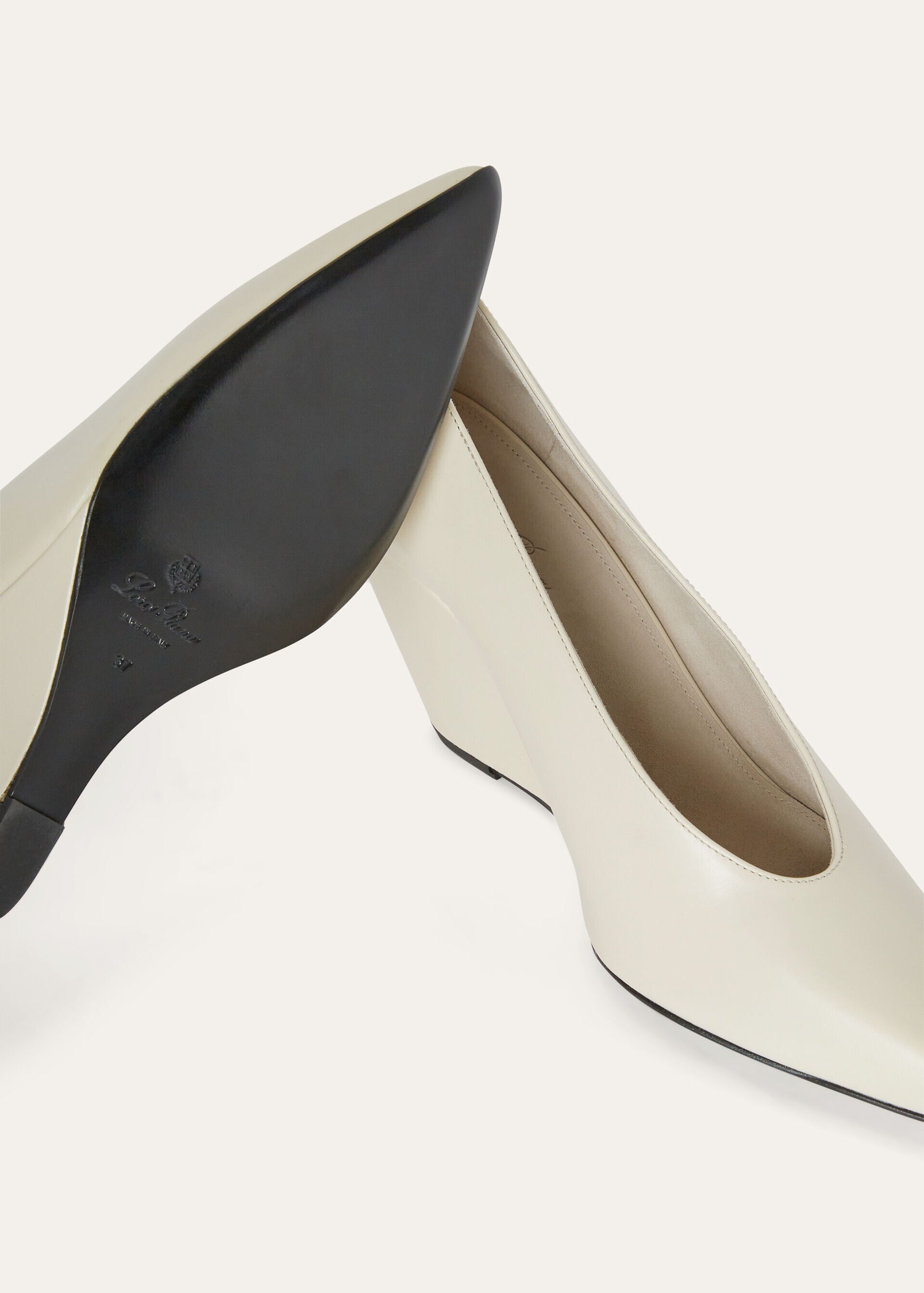Slip into these sophisticated wedge pumps, whose sleek silhouette tapers to a refined pointed toe. Crafted from exclusive calfskin and treated with natural wax, they have a lustrous sheen and crisp texture that exudes elegance with every step. Pair these pumps with a tailored pencil skirt and silk blouse for a smart, effortlessly polished ensemble.